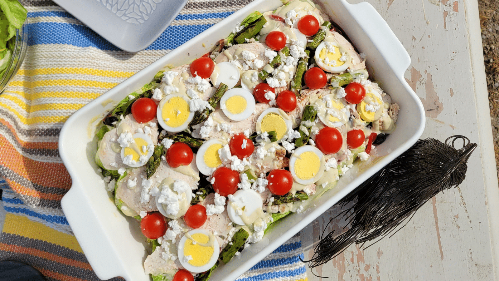 - Drizzle 1 cup of the dressing over the lettuce and beans. Add half each turkey, onion, eggs, asparagus, turkey bacon, add ½ cup dressing.