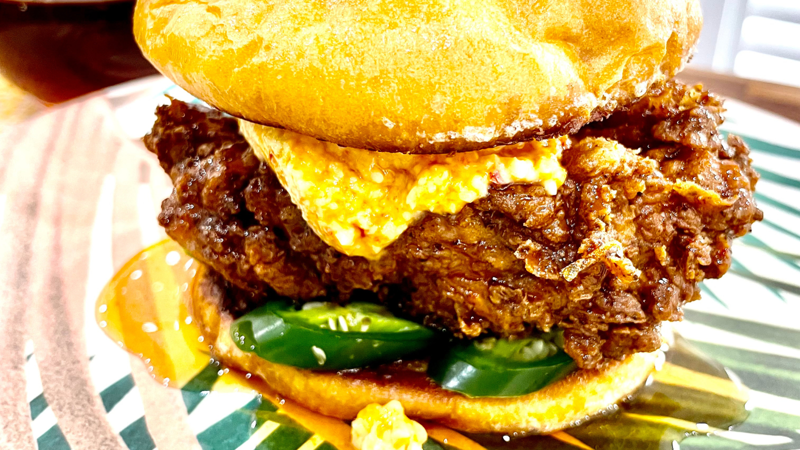 Assemble the sandwiches by placing one piece of chicken on the bottom bun, divide and pour syrup over the chicken, add a generous scoop of pimiento cheese, jalapeño slices, cover with top bun and press down slightly to spread the cheese. Repeat with the others.