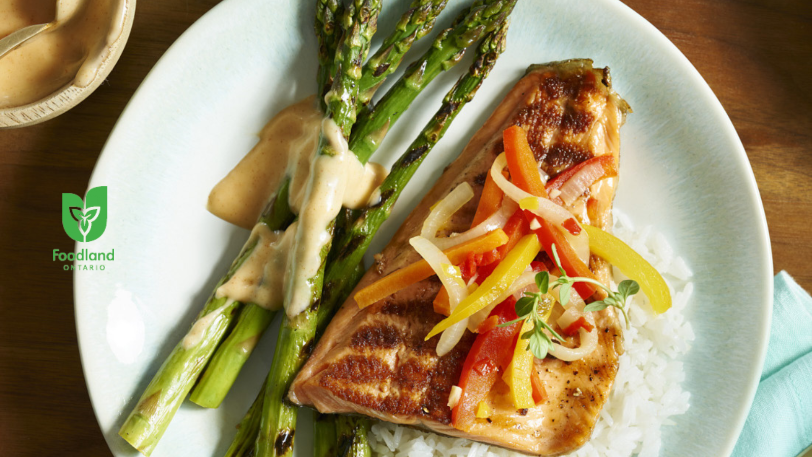 Delectable Ontario rainbow trout is grilled with asparagus spears